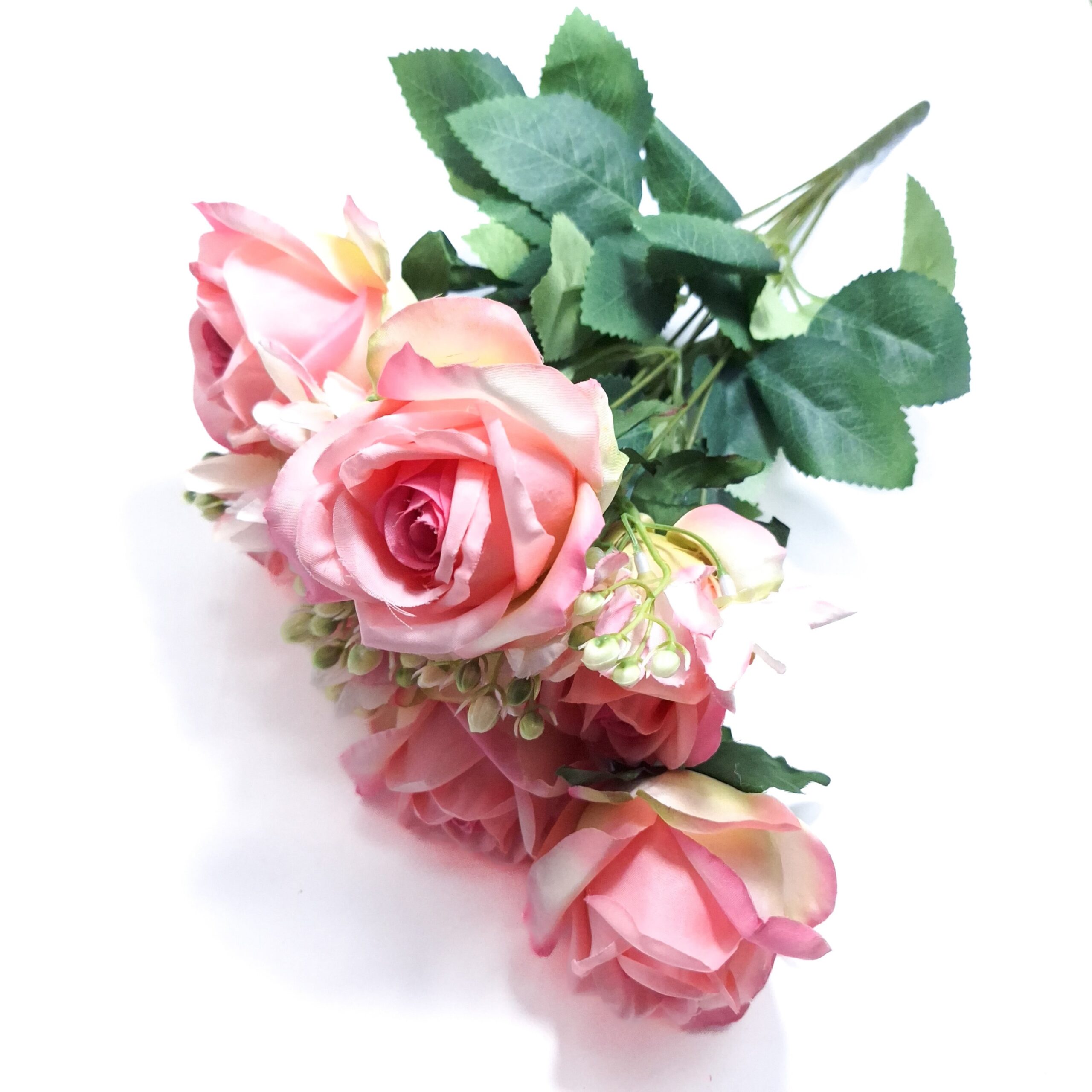 Un buchet rafinat compus din 6 trandafiri artificiali și 3 flori decorative asortate, realizat din material textil de calitate, ideal pentru aranjamente florale, decoruri festive sau cadouri deosebite. Frunzele verzi adaugă un plus de naturalețe, iar combinația armonioasă de culori îl face ușor de integrat în orice decor. Disponibil în mai multe variante de culoare: roșu, alb, portocaliu, roz, mov, galben și crem.