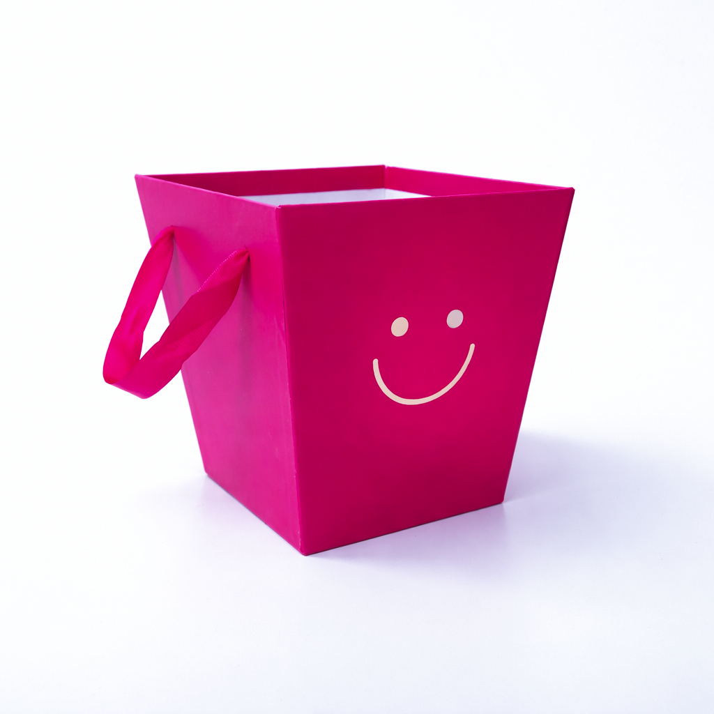 Realizată din carton rigid de calitate, cutia oferă rezistență și stabilitate, fiind potrivită pentru diverse tipuri de produse – de la aranjamente florale până la cadouri sau seturi tematice. Designul său este completat de un motiv auriu discret (tip smiley), care adaugă un accent jucăuș și atrăgător.