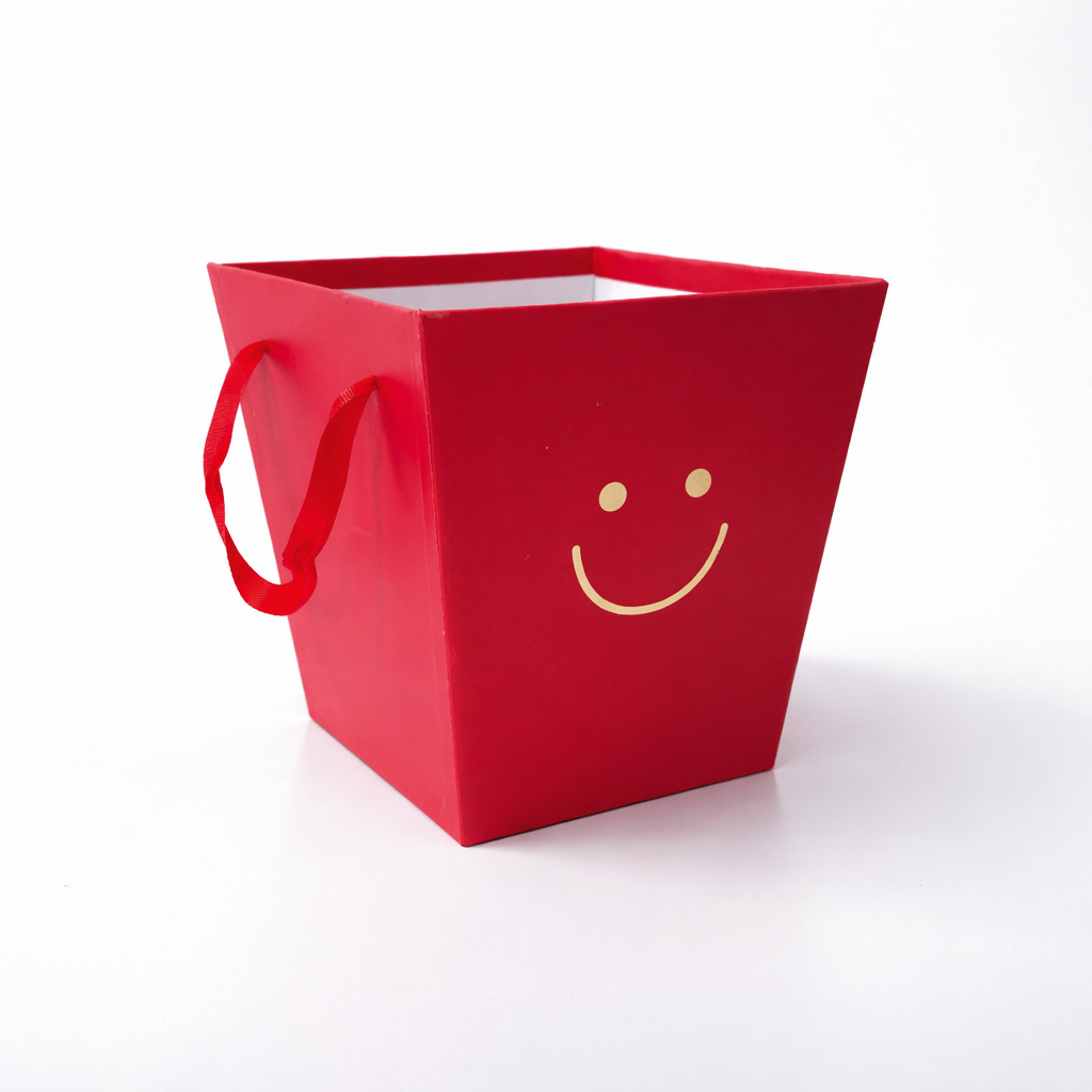 Realizată din carton rigid de calitate, cutia oferă rezistență și stabilitate, fiind potrivită pentru diverse tipuri de produse – de la aranjamente florale până la cadouri sau seturi tematice. Designul său este completat de un motiv auriu discret (tip smiley), care adaugă un accent jucăuș și atrăgător.