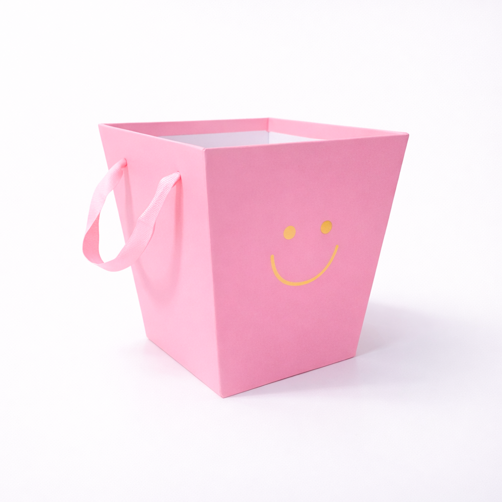 Realizată din carton rigid de calitate, cutia oferă rezistență și stabilitate, fiind potrivită pentru diverse tipuri de produse – de la aranjamente florale până la cadouri sau seturi tematice. Designul său este completat de un motiv auriu discret (tip smiley), care adaugă un accent jucăuș și atrăgător.