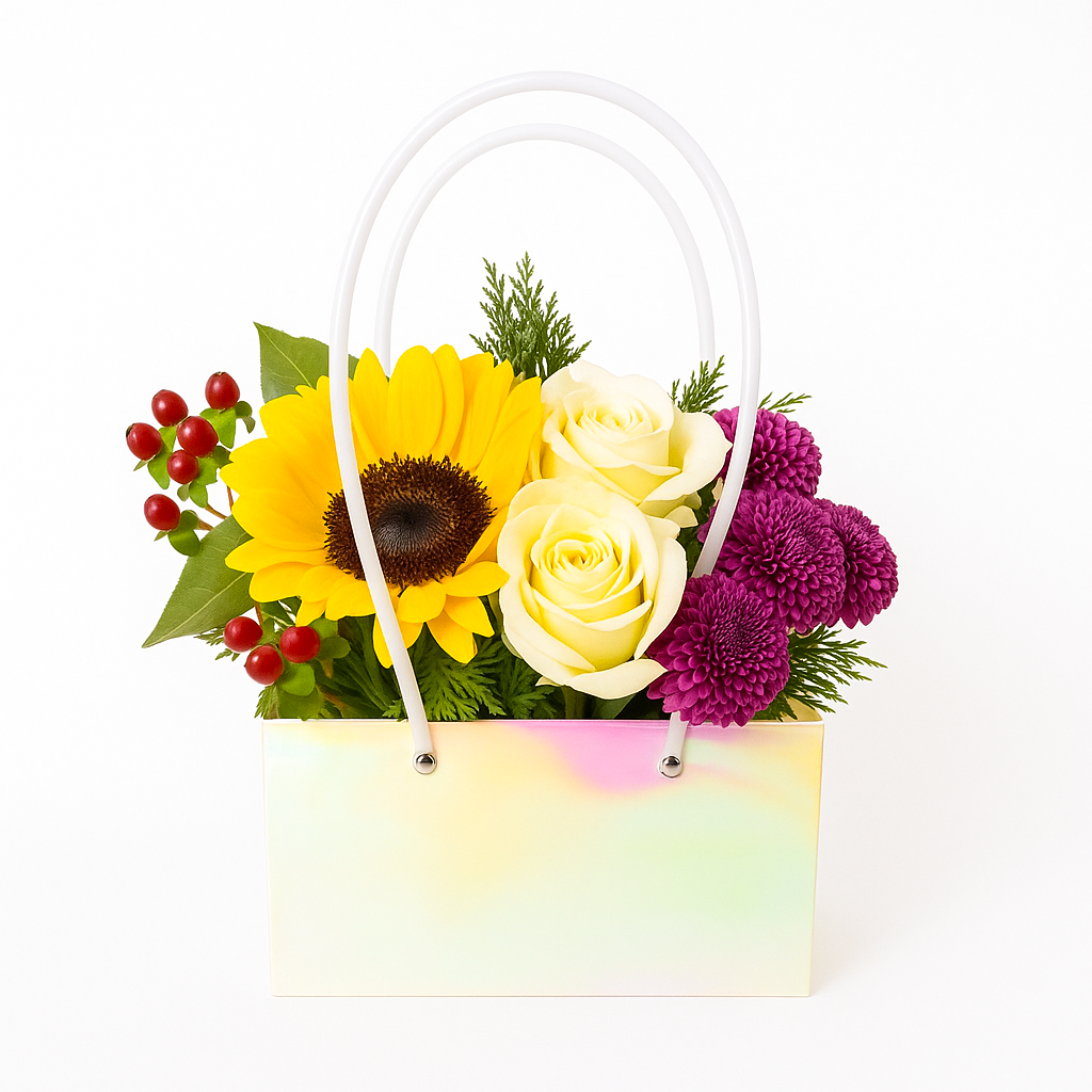 Setul de 10 sacoșe decorative este ideal pentru aranjamente florale, cadouri sau prezentări elegante. Realizate din carton rezistent, cu finisaj irizat rainbow, aceste sacoșe reflectă frumos lumina și adaugă un efect deosebit, modern și vesel, oricărui aranjament. Mânerele din plastic transparent oferă un plus de eleganță și sunt practice pentru transport.