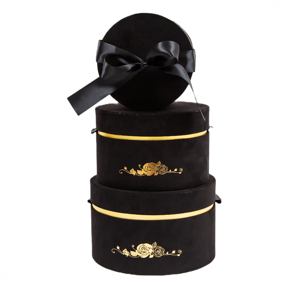 Set 3 cutii catifea cu fundita si print auriu, ce pot fi decorate cu flori sau cadouri.