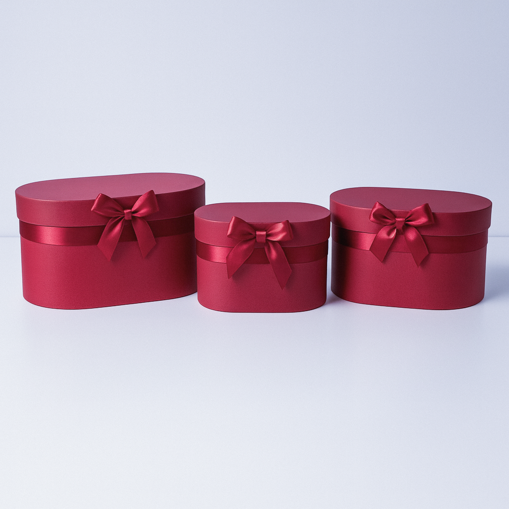 Set 3 Cutii Ovale din Carton cu Capac și Fundă Satinată – Ambalaj Premium pentru Cadouri și Aranjamente Florale