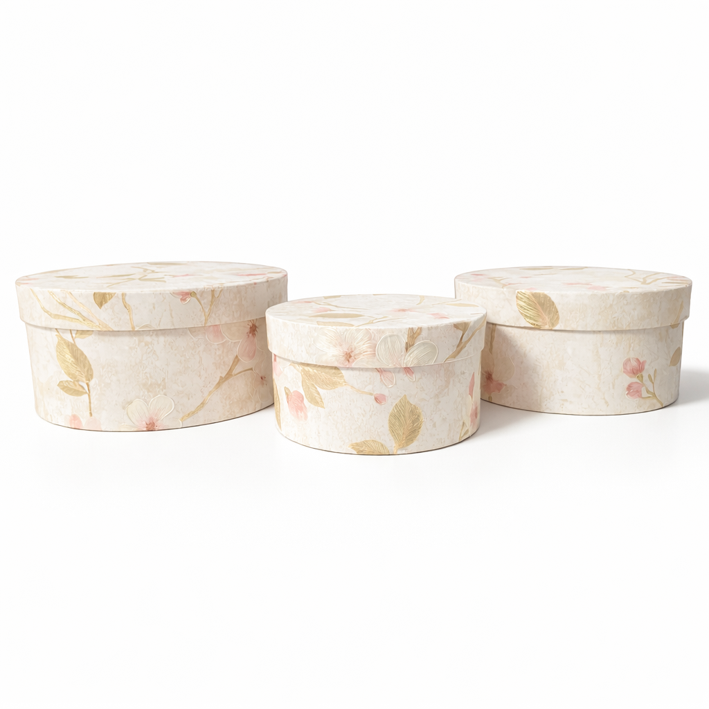 Set 3 cutii rotunde din carton cu print floral – elegante și versatile