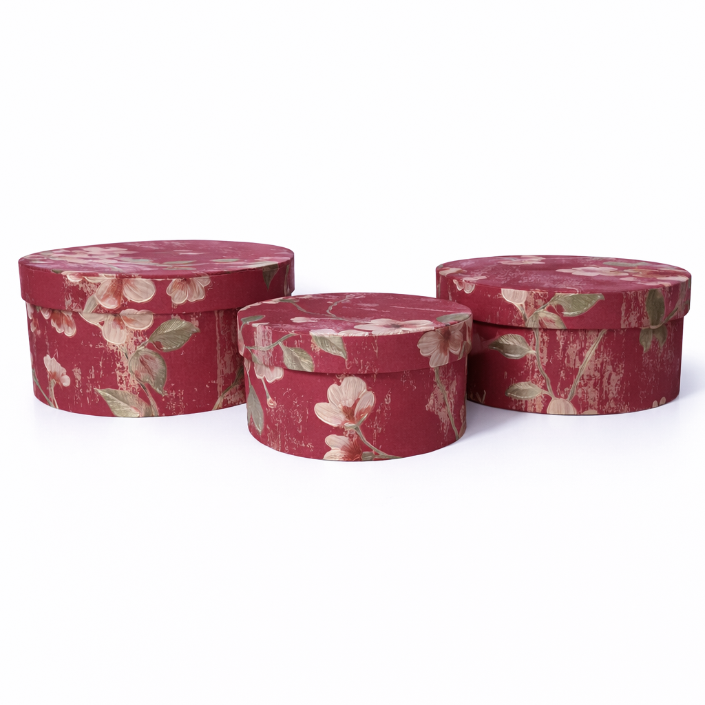 Set 3 cutii rotunde din carton cu print floral, culoare grena – ROC 5826